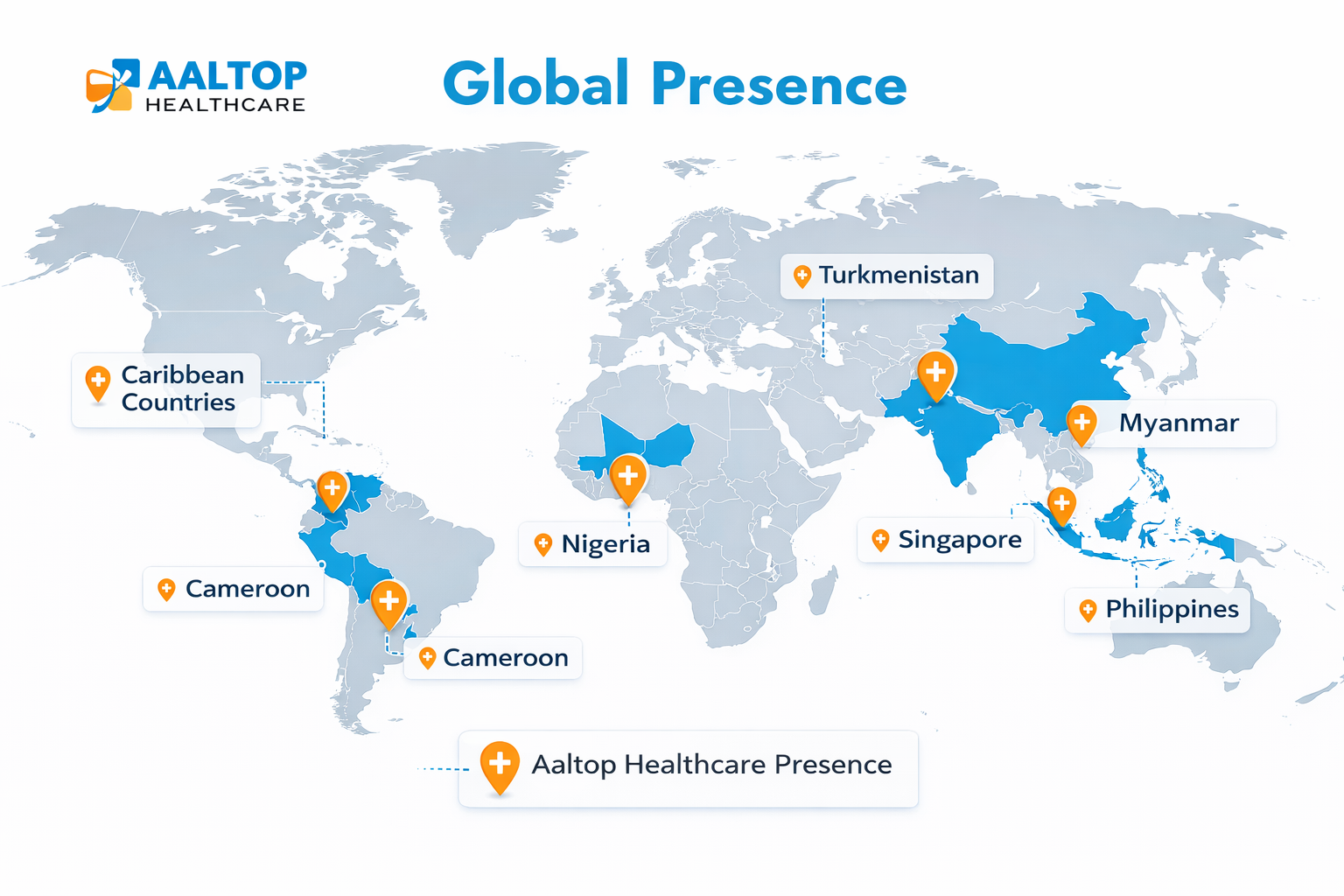 Aaltop Healthcare has established a strong international footprint by supplying pharmaceutical formulations, diagnostics, nutritionals, and medical disposables to emerging and regulated markets worldwide. Our global presence is supported by WHO-GMP compliant manufacturing, experienced regulatory teams, and efficient export logistics.